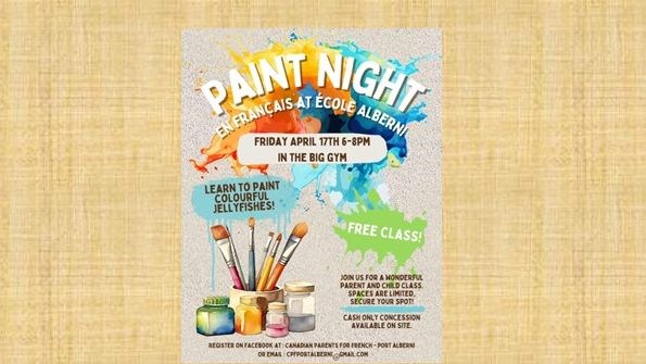 Please join us for a free paint night en français at École Alberni Elementary field house on April 17 at 6pm. This is designed as a family activity where children and caregivers can paint together. There will be a cash only concession on site for those who wish to purchase food and drinks. Space is limited so please email cpfportalberni@gmail.com to secure your space.