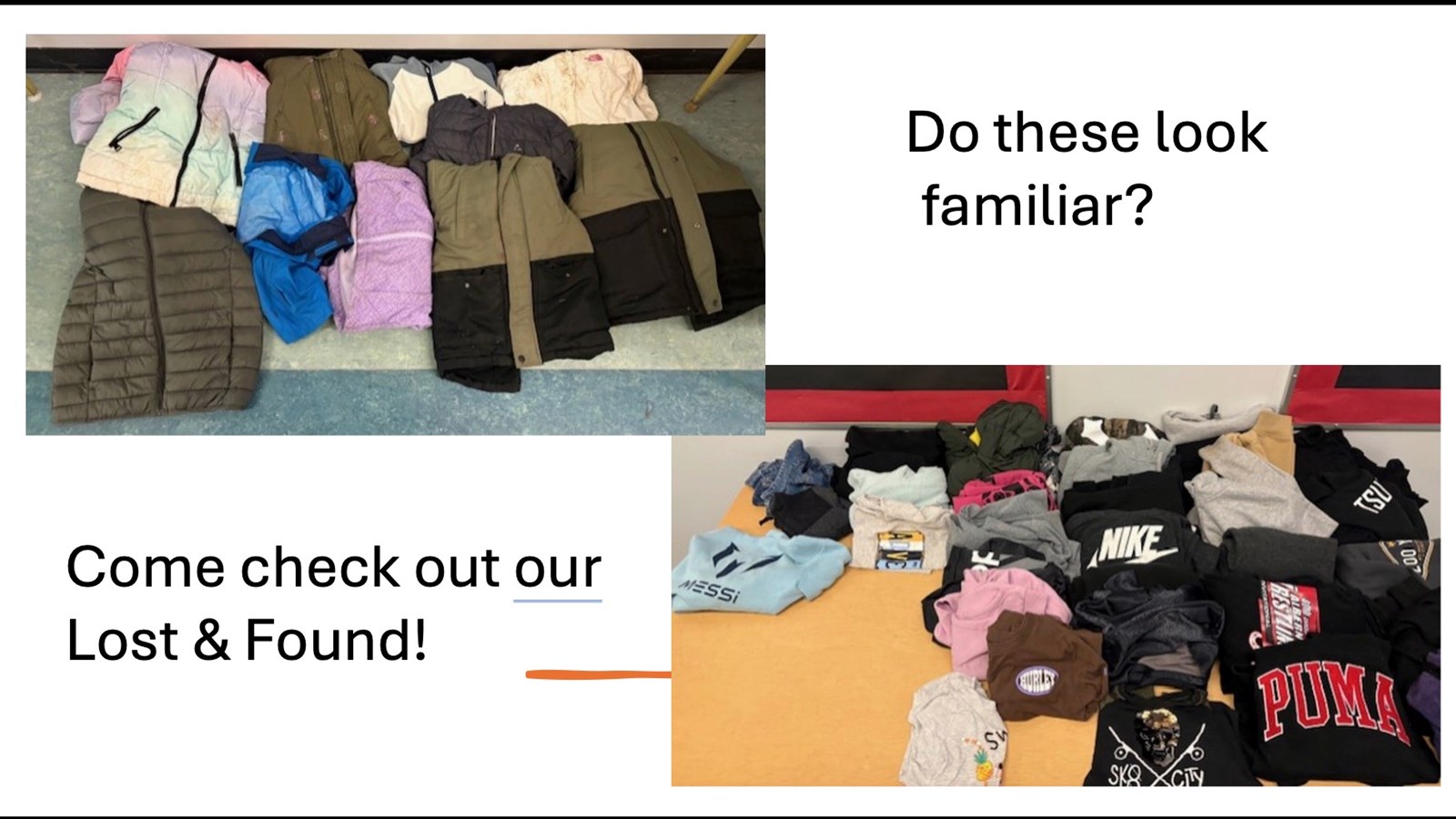 Please come by the office area and check for your child's belongings. All unclaimed items will be donated during winter break.